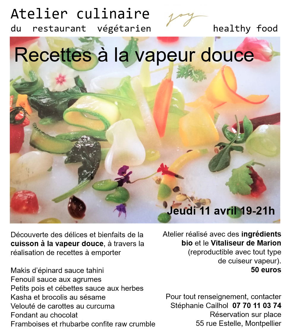 Je collabore également avec des professionnels du bien-être (ateliers culinaires et confection de repas lors de stages de yoga) et des restaurateurs (ateliers culinaires autour de la vapeur douce chez Joy Healthyfood à Montpellier).